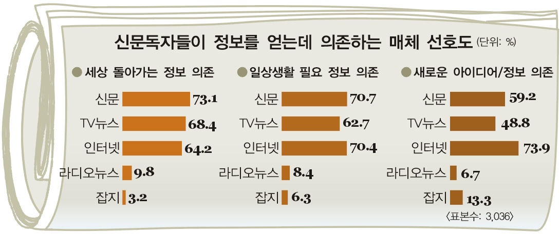 일상생활에 필요한 정보에서도 신문(70.7%), 인터넷(70.4%),TV뉴스(62.7%)순으로 신문에 대한 의존도가 가장 높았다. 반면 새로운 아이디어에 대한 정보 의존도는 인터넷(73.9%)이 가장 높았으며, 신문(59.2%),TV뉴스(48.8%)가 그 뒤를 이었다. 기사 유형에 대한 열독률 조사에선 특별기획기사(38.8%)가 가장 높았고, 사회·교육(31.8%), 경제(29.0%), 정치(27.5%), 스포츠(27.1%), 국제(27.0%) 등의 순이었다.