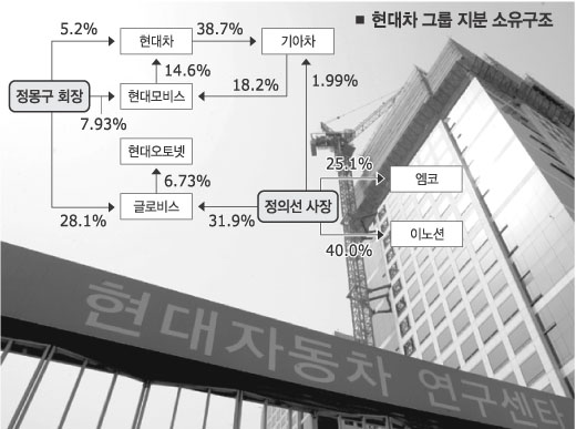 정 사장은 2002년 자신이 지분 30%를 갖고 있던 본텍(올초 현대오토넷에 합병)과 현대모비스의 합병을 통해 ‘지분고리’에 뛰어들려고 했지만 시장의 반발로 실패했다. 이후 비상장 계열사 지분 매각 대금으로 또다른 연결고리인 기아차 지분 매입에 나서 현재 1.99%를 보유 중이다.