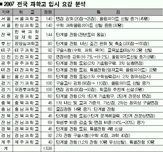 10일 청솔학원 평가연구소에 따르면 전국 19개 과학고는 지난해에 비해 14명이 늘어난 1536명을 선발한다. 서울과학고를 비롯한 인천, 경기, 의정부, 전남과학고 등은 구술면접 비중을 늘린다. 광주과학고와 대전, 울산, 전북, 경북과학고 등은 올해 일반전형에서 처음으로 단계별 전형을 도입할 방침이다. 이에 따라 일반전형에서 단계별 전형을 시행하는 학교는 한국과학영재학교, 장영실과학고, 강원, 충북, 충남, 제주과학고 등 6곳에서 모두 11곳으로 확대된다.