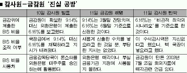 외환은행 매각 당시 국제결제은행(BIS) 기준 자기자본비율 ‘조작 의혹’과 관련, 감사원과 금융감독원이 치열한 ‘진실 공방’을 벌이고 있다.