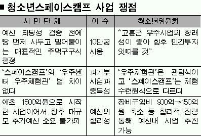 2003년 문화관광부는 전남 고흥군 동일면에 지을 청소년 스페이스 캠프 사업에 착수하면서 1500억원의 예산을 신청했다. 하지만 예산처는 예비타당성 조사에서 ‘비용 대비 편익(B/C)’ 비율이 0.35(1.0 이하면 경제성이 떨어진다는 뜻)로 경제성이 매우 낮다는 결론을 내렸다. 또 과학기술부가 2007년 하반기 준공을 목표로 건설 중인 우주센터 우주체험관과 8㎞밖에 떨어져 있지 않은 데다 별 차이점도 없다며 480억원만 예산을 내주었다. 이후 소강상태에 빠졌던 스페이스 캠프 사업은 지난해 4월 문광부 청소년국이 청소년위로 독립하면서 재개됐다. 청소년위는 새롭게 1413억원 규모로 예산을 편성, 신청했으나 예산처는 지난해 8월 “기존 사업안과 별 차이가 없다.”며 다시 480억원만 승인했다.