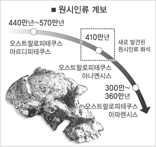 발견된 화석은 약 410만년 전에 살았던 원시인류 8명의 치아와 턱뼈 부분이다. 발굴팀의 팀 화이트 박사는 “오스트랄로피테쿠스와 아르디피테쿠스라는 앞선 인류 사이에 존재하는 100만년의 간격을 메워줄 것”이라고 밝혔다.