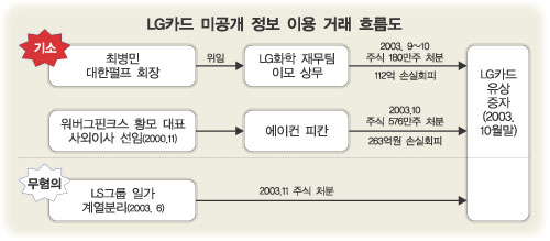 LG카드 부도사태와 관련, 당초 노조와 민주노동당, 참여연대 등이 고발한 인원은 수십명. 구본무 LG그룹 회장을 포함, 총수 일가 대부분이 포함됐다.LG그룹 재무담당자 이모씨가 관리한 총수 일가 주식끼리의 거래는 활발했지만, 검찰은 이 중 시장으로 빠져나간 거래에 대해서만 증권거래법 위반 혐의를 적용했다. 당시 최병민 대한펄프 회장이 보유한 180만주(112억여원)의 거래에 대해서만 위법성이 인정돼 최씨와 이씨가 기소됐다. 검찰은 당시 총수 일가끼리 주식거래가 활발한 이유를 LG그룹 계열분리 시점과 연결짓고, 이들의 거래를 시장에 유출되지 않는 자전거래로 판단했다. 그해 11월7일 구본무 LG그룹 회장이 판 LG카드 주식 65만주를 허동수 GS칼텍스 회장 등 4명에게 전량 흡수한 거래가 그 예이다.