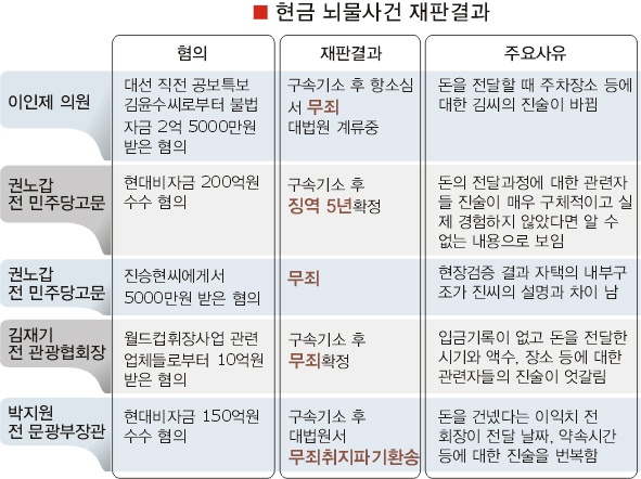 이미 뇌물수수 혐의를 받던 많은 정치인 등이 증거불충분 등을 이유로 무죄를 선고받았다. 염동연·이인제 의원, 박주선 전 의원, 김홍업씨, 안상수 인천시장, 박광태 광주광역시장, 박지원 전 문화관광부장관 등이다.