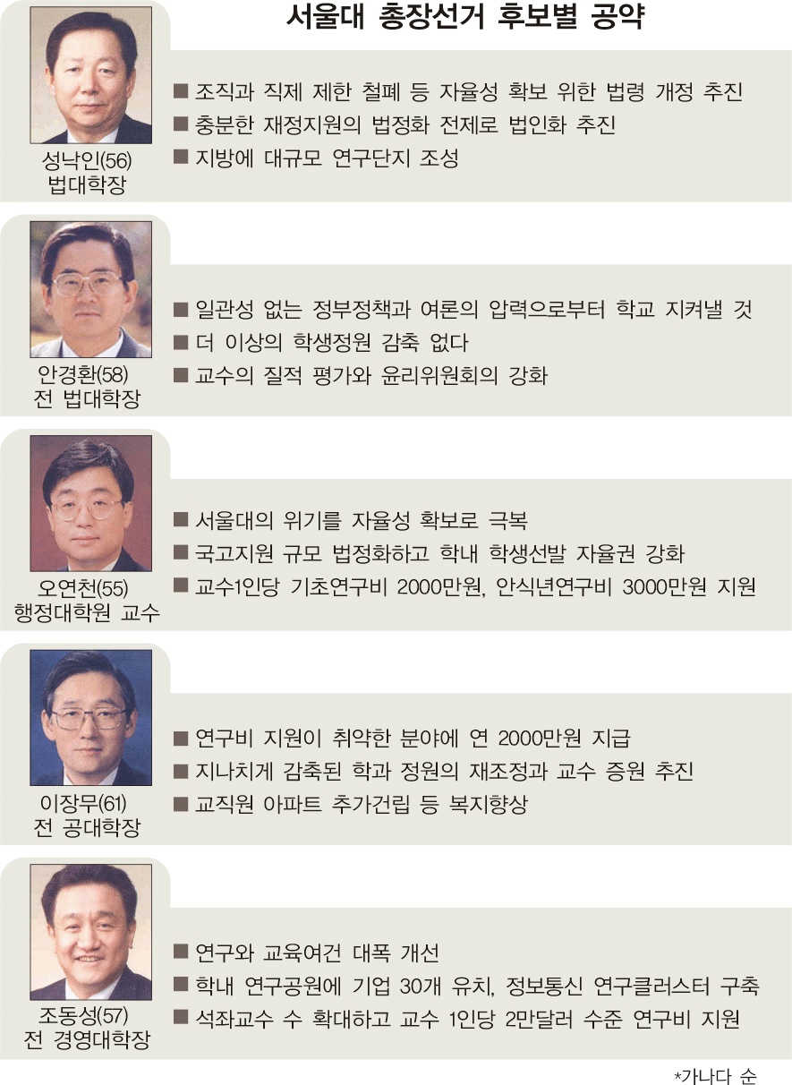서울대 총장후보선정위원회는 25일 회의를 열고 1차 선정된 8명 중 성낙인 법대 학장, 안경환 전 법대 학장, 오연천 행정대학원 교수, 이장무 전 공대 학장, 조동성 전 경영대 학장(가나다순)을 최종 후보로 선정했다.