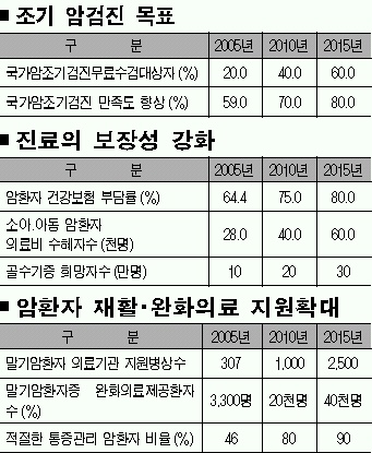 ●국가 암 조기검진 확대 연간 검진 규모를 현재 200만건에서 2015년에는 900만건으로 확대하고, 국가 암 조기검진율을 20%에서 60%로 확대하게 된다. 유방암과 자궁경부암 등 암별 특성에 맞는 검진프로그램을 개발하고, 암 종별 검진기관을 확대하며 국립암센터, 지역암센터 및 지방의료원별로 이동검진 사업도 실시하게 된다.