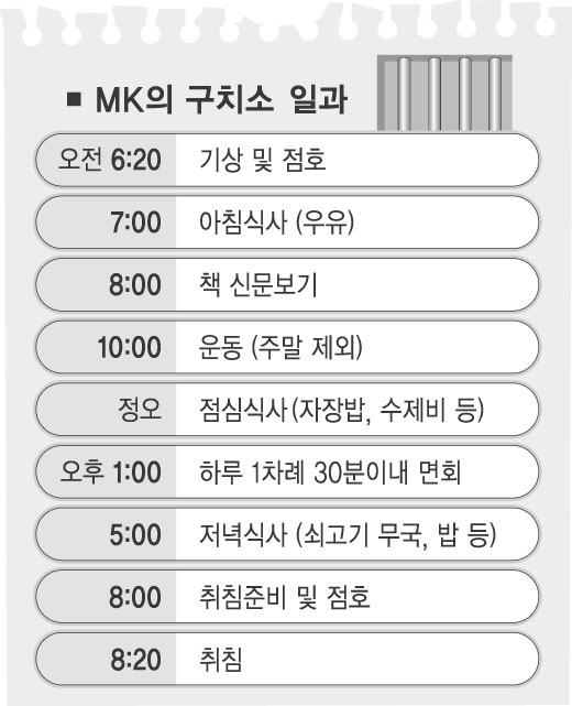 구치소 일과에 맞춰 전날 오후 8시30분쯤 취침한 뒤 이날 오전 6시20분에 일어난 정 회장은 이부자리를 스스로 개고 아침 점호를 받았다. 재소자들의 신변관리를 위해 한밤에도 조명을 끄지 않기 때문에 간밤 잠자리가 다소 불편할 수도 있지만 정 회장은 평상시 생활처럼 흰 우유 한 팩으로 아침식사를 했다.