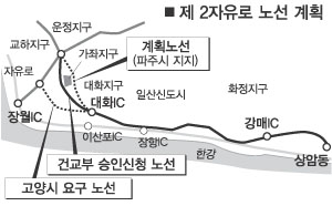제2자유로 건설은 파주 운정신도시 개발에 따른 광역교통대책으로 2003년 11월 마련됐다. 계획안은 운정신도시∼고양 대화IC∼고양 강매IC∼서울 상암 25㎞와 김포∼관산 7.54㎞를 2008년 말까지 개설한다는 내용이었다. 그러나 고양지역 대화마을 주민들이 소음 피해를 들어 자유로쪽으로 5㎞ 우회하라고 주장했고 고양시와 파주시간 갈등으로 확대, 건교부 승인신청이 미뤄져 왔다.