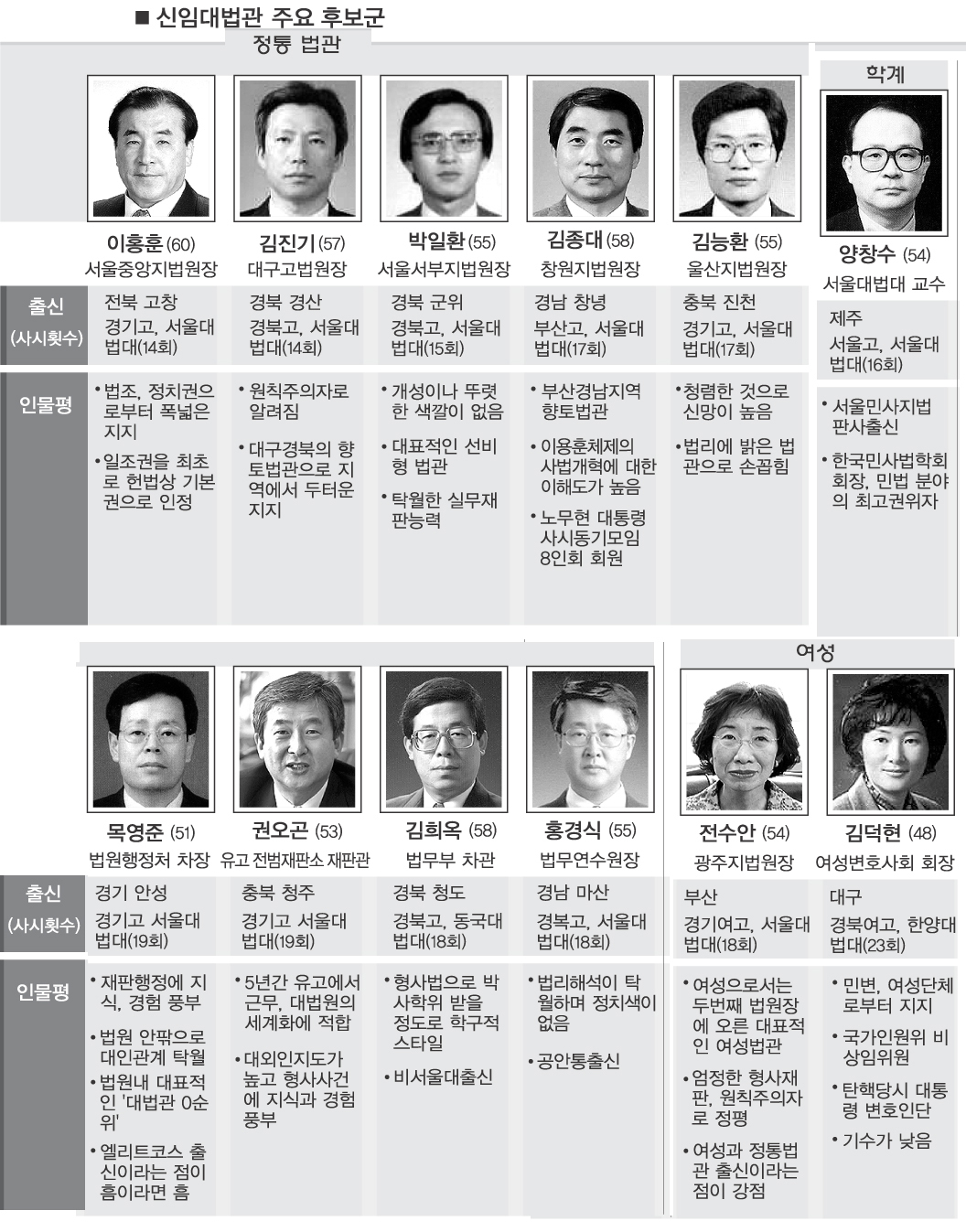 올해 대법관 인선에 관심이 쏠리는 이유는 사법부의 ‘정체성’에 획기적 변화가 있을 것이라는 예상 때문이다. 특히 대법관은 법리적 갈등과 쟁점을 매듭짓는 자리이기 때문에 전체 대법관의 구성이 초미의 관심사인데, 노무현 대통령이 임명한 이용훈 대법원장이 어떤 성향의 후임 대법관을 선임할지 법조계는 물론 사회 각계의 이목이 집중되고 있다. 대법원은 22일부터 사회 각계에서 대법관 후보들을 추천받고 다음달 5일쯤 대법관제청자문위원회를 열어 대법관 후보 5명을 결정할 예정이다.