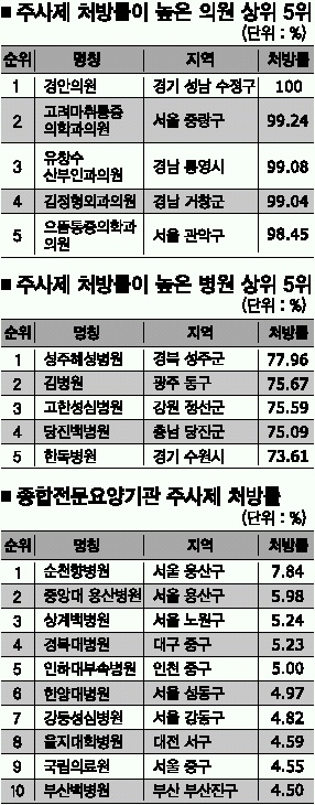 의원 중에는 처방률이 한 건도 없는 곳이 435곳이었으나 경기도 성남 경안의원은 100%를 기록했고, 서울 중랑구 고려 마취통증 의학과의원(99.24%), 경남 통영시 유창수 산부인과의원(99.08%), 경남 거창군 김정형외과의원(99.04%) 등도 100%에 가까운 주사제 처방률을 보였다. 의료기관별 주사제 처방률은 심사평가원 홈페이지(www.hira.or.kr)에 올라 있다.