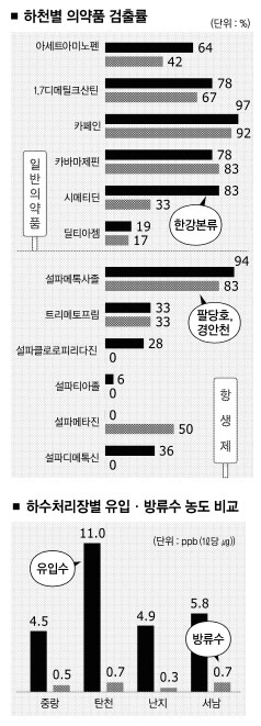 의약품 별 오염농도는 하수처리 전 단계인 하수처리장 유입수가 가장 높았고, 방류수-한강물 등 순이다. 탄천하수처리장 유입수는 의약품의 평균 오염농도가 11ppb로 한강 본류의 오염도보다 수 백배나 높았다. 의약품 잔류물질이 하수처리 과정을 거치면서 크게 희석된 상태로 한강에 배출됐음을 뜻한다.(그래프 참조)