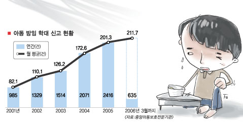 사회복지법인 중앙아동보호전문기관이 접수한 전국의 방임 학대 건수는 2001년 985건,2002년 1329건,2003년 1514건,2004년 2071건, 지난해 2416건으로 가파르게 늘고 있다. 올해도 3월까지 635건이나 접수돼 수치상으론 2500건을 넘을 것으로 추정된다. 특히 지난해 신고에서 드러난 방임 사례 3385건(중복사례 포함)을 분석한 결과 아동에게 의식주를 제공하지 않거나 장시간 위험하고 불결한 주거환경에 방치한 물리적 방임이 1649건으로 48.7%를 차지했다. 교육적 방임 717건(21.2%), 의료적 방임 315건(9.3%), 가출아동을 찾지 않는 방임이 189건(5.6%) 순이었다.