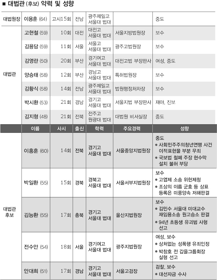 남아 있는 대법관들을 성향으로 분류하면 보수 4명(고현철, 김용담, 양승태, 김황식 대법관), 중도 3명(이용훈 대법원장, 김영란, 김지형 대법관), 진보 1명(박시환 대법관) 등으로 구분할 수 있다. 새로 제청된 신임 대법관 5명도 보수(김능환, 박일환, 안대희, 전수안)가 중도(이홍훈)보다 많다. 이들이 모두 임명될 경우 대법원은 여전히 보수가 8명, 중도가 4명, 진보가 1명으로 보수 성향이 우세하다고 할 수 있다. 하지만 2명의 여성 대법관을 비롯해 보수성향 법관 일색의 대법관에서 다양한 출신과 성향의 대법관으로 구성됐다고 평가할 수 있다.