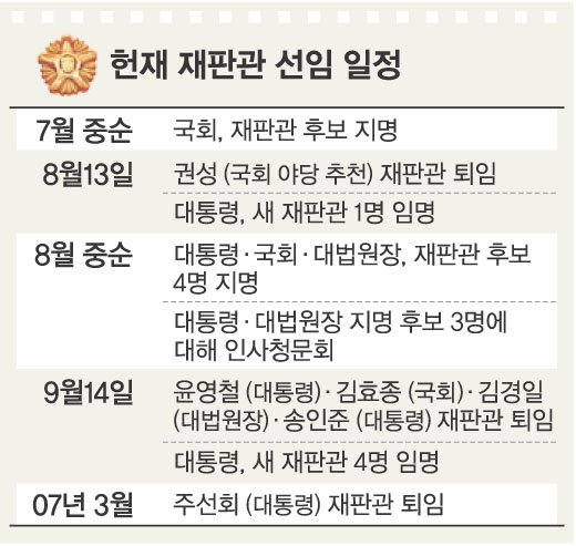 권성(사시 8회) 재판관이 퇴임하는 8월13일에 공석이 1석 생긴다. 윤 소장을 비롯해 김효종(8회)·김경일(8회)·송인준(10회) 재판관이 함께 퇴임하는 9월14일에는 4석이 빈다. 대통령 지명이 2명, 국회 야당 지명이 1명, 여야가 합의해 선출하는 인사가 1명, 대법원장 지명이 1명이다.3권분립 구현을 위해 헌재 재판관은 3명씩 대통령과 국회, 대법원장이 나눠서 지명하게 돼 있다.