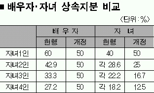 현행 법은 자녀가 1명인 경우 배우자 상속분이 60%에 이르지만 자녀가 2명일 때는 42.9%,3명일 때는 33.3%,4명이면 27.2%까지 떨어지도록 돼 있어 불합리하다는 지적을 받아왔다.