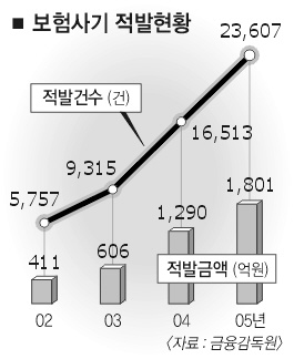 금감원에 따르면 지난해 보험사기 적발 건수는 2만 3607건으로 전년(1만 6513건)에 비해 42.6%, 적발 금액은 1801억원으로 39.6% 각각 증가했다.