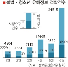 동영상 서비스가 확대되고 있는 가운데 올 들어 인터넷에서 음란물 등은 폭증했다.13일 정보통신윤리위원회에 따르면 불법·청소년 유해정보 심의 건수는 6월 한 달간 3만 4515건으로 지난 1월에 비해 8배나 늘었다. 지난해 심의 건수(8만 6191건)의 40%에 해당하는 양이 지난 한 달간 발생한 것이다.