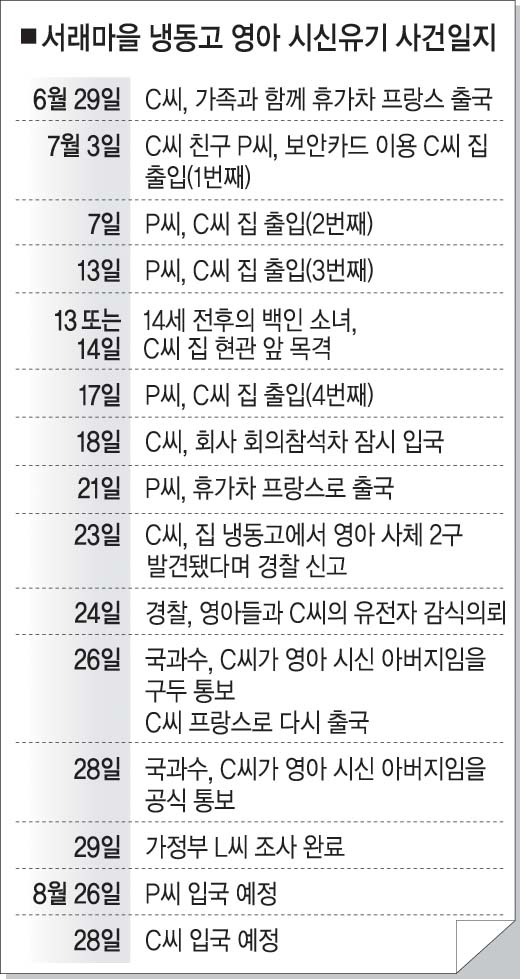 지난 23일 서울 반포동 서래마을(프랑스인 밀집거주지역)에서 냉동시신으로 발견된 영아 2명이 집주인 C(40·프랑스인)씨의 아들들로 드러났지만 의문점은 여전히 꼬리에 꼬리를 물고 있다. 왜 아버지인 C씨가 경찰에 신고를 했는지, 영아들의 어머니는 과연 누구인지 등이 베일에 가려 있다.