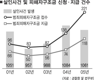 지난달 1일부터 개정돼 시행하고 있는 범죄피해자구조금 제도도 여전히 복잡한 절차로 큰 도움이 되지 못하고 있다. 제도에 대한 홍보가 미흡한 데다 피해자가 직접 관련 서류를 갖추고 찾아가 신청하지 않으면 활용이 안 된다. 이 때문에 경찰청 통계에 따르면 2005년 한해 동안 강력 범죄 가운데 살인 사건만 1061건이 발생했지만 유족 구조금 신청자는 189건에 그쳤다. 게다가 구조금도 일회성 지원에 그쳐 미성년자 등을 위한 장기적인 지원체계를 갖출 필요가 있다는 지적도 나오고 있다.