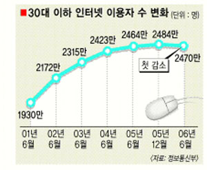 정보통신부와 한국인터넷진흥원은 9일 올해 상반기 정보화실태조사 결과,6월 기준으로 30대 이하(만 6세 이상) 인터넷 이용자수는 지난해 12월보다 14만명 줄었다고 밝혔다.
