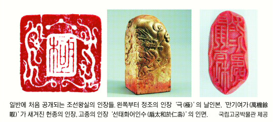 조선시대 임금들이 서책이나 회화, 편지봉투 등에 찍었던 개인 인장(도장) 250여점이 처음으로 공개됐다. 국새·어보 등 공적인 도장과 달리 임금 개인의 취향과 인간관계 등이 담겨 있어 조선시대 학문·예술세계를 연구하는 데 귀중한 자료들이다.