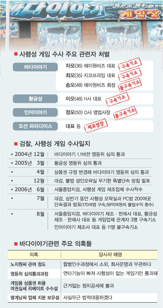 사행성 게임인 ‘바다이야기’ 문제를 둘러싼 의혹이 확산되자 검찰이 20일 그동안 진행 중이던 사행성 게임 업체에 대한 수사 과정을 자세히 설명했다. 사행성 부분에 집중돼 온 수사는 앞으로 영상물등급심사위 심사과정이나 관련 회사들의 영업과정에서 정치권 로비가 있었는지 규명해야 한다. 검찰은 사행성 게임장이 불법자금을 합법적으로 융통하기 위한 돈세탁 장소로 활용됐는지도 수사 중이다.
