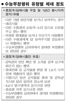 올해부터 대학수학능력시험에서 휴대전화 등 금지물품을 갖고 있다 적발되면 해당 시험은 무효 처리되지만 이듬해 시험에는 응시할 수 있게 된다. 또 지난해 수능시험에서 휴대전화를 갖고 있다 적발된 단순 부정행위자 38명은 올해 시험에 응시할 수 있다.