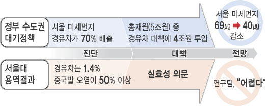 국가 대기정책의 근간을 흔들 만한 연구보고서가 나왔다. 서울 미세먼지 오염의 주범은 ‘중국발 오염물질’이며, 이 때문에 경유자동차 규제 등 국내대책에 초점을 맞춘 현 정책은 근본적으로 잘못됐을 수 있다는 지적이다. 정부가 지난해 10월 확정, 시행 중인 수도권대기개선특별대책(2005∼2014년)의 방향과는 판이한 것이어서 파장이 예상된다.
