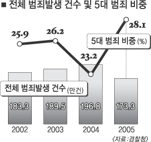 최근 몇년간 5대 범죄 발생건수는 등락을 반복했지만 피의자 검거율은 3년째 하락세다.2002년 검거율은 84.2%였으나 2003년 80.3%,2004년 79.7%,2005년 72.7%를 기록했다.