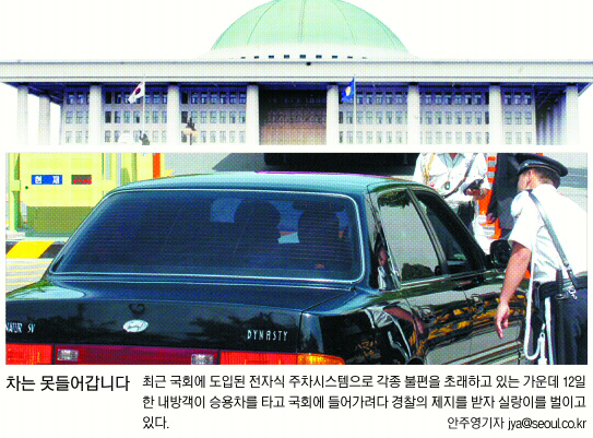 특히 하루에 3500∼4000명에 이르는 국회 이용객을 고려하지 않은 채 주차설비 시스템을 도입, 국회 도서관을 찾는 시민이나 본관 및 의원회관을 찾는 민원인, 각종 세미나 참석자들의 불편을 초래하고 있는 것으로 지적됐다.