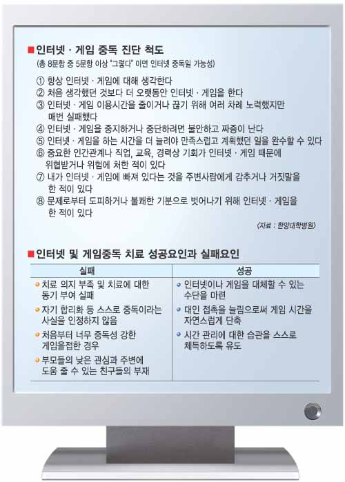 또 이군이 다른 사람들과 접촉할 수 있는 기회를 많이 만들어 줬다. 이를 위해 사람들과 직접 만나서 해야 하는 ‘브루마블’‘젠가’ 등 보드게임을 하도록 유도하며 친구들을 다시 사귈 수 있는 기회를 제공했다. 그러자 차차 이군의 컴퓨터 접촉 시간이 줄어갔다. 이군은 요즘 온라인게임에 대해 “재미없다. 따분하다.”는 반응을 보이고 있다. 온라인게임을 완전히 끊은 것은 아니지만 한창 때의 10분의1인 하루 1시간 정도만 하고 있다. ●사례2 : 김현갑(13·중1)군은 공부가 힘들어지자 게임에 몰두했다. 초등학교 때 경시대회 입상 경력도 있었던 김군은 늘어나는 학교·학원 수업에 흥미를 잃으면서 게임에 몰두했다. 중독성이 높은 MMORPG는 아니었지만 방학때 게임시간이 급격히 늘자 깜짝 놀란 부모가 병원에 데리고 왔다. 김군의 치료는 자기 생활관리에 대한 약속에서부터 시작했다. 김군은 의료진이 지켜보는 가운데 게임시간에 대해 부모와 약속을 했다. 약속시간을 지키지 않으면 그만큼 인터넷 접속시간을 줄이는 벌을 받았다. 반면 약속시간을 지키면 책을 선물로 받았다. 약속을 지키는 날이 쌓이면서 시간관리를 자연스럽게 체득한 김군은 게임시간을 스스로 조절할 수 있는 단계에 다다랐다.