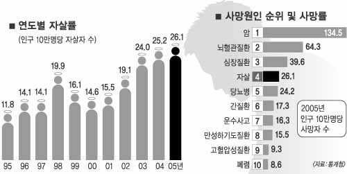 18일 통계청이 발표한 ‘2005년 사망원인 통계결과’에 따르면 지난해 사망자 수는 24만 6000명으로 하루 평균 673명씩 사망했다. 이 가운데 자살한 사람은 1만 2047명에 달했다. 인구 10만명당 자살한 사람을 나타내는 자살률은 26.1명으로 전체 사망원인 가운데 4위를 기록했다.1995년 자살률 11.8명의 2.2배 수준으로 당시 사망원인은 9위였다. 성별로는 남성의 자살률이 34.9명으로 여성 17.3명보다 2배 이상 높았다. 특히 고령층일수록 자살률이 높아 80세 이상은 10만명당 127명,70대는 80.2명,60대는 54.6명,40대는 34.6명으로 나타났다.10대는 4.2명 수준이다.