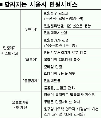 이밖에 내년 1월 시청사 서소문별관 1동 1층에 ‘민원플라자’가 설치되며, 민원예약시스템을 도입해 민원인들이 대기하거나 재방문하는 일이 없도록 할 예정이다. 휴대전화로 민원접수를 받고 처리하는 ‘모피드 시스템’을 통해 입찰·채용정보, 문화행사 등 각종 시정정보를 시민들에게 보다 빨리 전해준다.