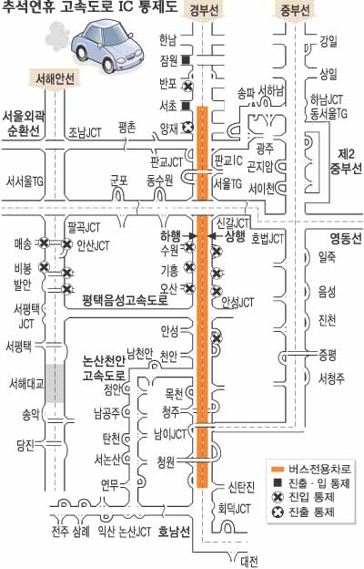 귀경시에는 다음달 6일 정오부터 8일 자정까지 경부고속도로 안성·오산IC 등의 진입통제가 이뤄진다(그래프 참조).