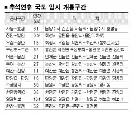 ●새달 4일 경부고속도 버스 전용차로제 정부는 연휴 기간동안 고속·시외버스와 철도, 항공편 등 주요 교통수단의 운행을 평소보다 대폭 늘리기로 했다. 이와 함께 확장공사 중인 고속도로·국도의 13개 구간이 임시개통된다(표 참조).