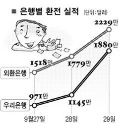 외환은행도 9월27일 1518만달러에서 29일 2229만달러로 증가했다. 하루 5만여명씩 해외로 빠져나간 지난 1일 이후의 실적을 보태면 은행들의 환전 실적은 기하급수적으로 늘 전망이다.