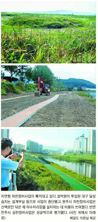 부산시 북구의 대천천 생태계복원 사업은 2003년부터 6억원을 들여 지난 7월 끝났으나 집중호우로 호안 자연석과 산책로 등이 유실돼 부실시공 시비를 불렀다. 부산시는 최근 소방방재청으로부터 지원받은 18억원의 수해복구비를 콘크리트 호안 철거 등 자연형 하천복원사업에 다시 투입할 계획이라고 배 의원은 전했다. 예산 95억원이 투입돼 내년 1월 완공 예정인 전주시 삼천 복원사업은 이와 반대로 습지생태계가 성공적으로 조성된 것으로 평가됐다.