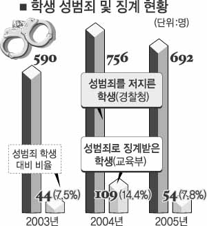 8일 열린우리당 정봉주 의원이 교육인적자원부와 경찰청으로부터 받은 국정감사 자료에 의하면 지난해 성희롱·성폭력 등 성범죄를 저지른 초·중·고 학생은 692명에 달했으나 학교에서 학교봉사·사회봉사·특별교육·퇴학 등 징계를 받은 학생은 7.8%인 54명에 불과했다.2003년에는 590명 중 44명(7.5%), 2004년에는 756명 중 109명(14.4%)이 징계를 받았다.