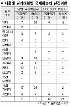 1453명에 이르는 서울대 교수(의과대학 제외) 중 과학기술논문인용색인(SCI), 사회과학논문인용색인(SSCI) 등 국제적으로 권위있는 학술지에서 편집위원으로 활동하는 사람은 고작 13명에 불과하다.SCI급과 SSCI급 국제학술지가 각각 5000여종과 2000여종에 이르는 것을 감안하면 극히 미미한 숫자다. 편집위원은 학술지에 논문을 실을지 여부를 결정하는 사람들로 해당 분야 최고 수준의 실력을 국제적으로 인정받아야 될 수 있다.