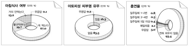 초·중·고등학생 3명 가운데 1명은 아침을 불규칙적으로 먹거나 거르는 것으로 파악됐다.4명 가운데 1명은 아토피성 피부염이나 천식을 앓고 있다.