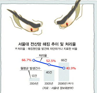 7일 서울대 정보화본부에 따르면 올 1∼6월 서울대에서 발생한 해킹은 월 평균 66건으로 지난해 40건에 비해 65%가 늘었다. 서울대 해킹은 2004년 월 평균 12건을 기록한 이후 해마다 가파른 증가세를 보이고 있다. 올해 해킹사례 가운데 취약점을 발견해 치료하고 차단조치를 한 경우는 월 평균 27건으로 전체 해킹사례의 40.9%에 불과했다. 해킹 처리율은 2004년 66.7%, 지난해 52.5% 등 갈수록 낮아지고 있다.
