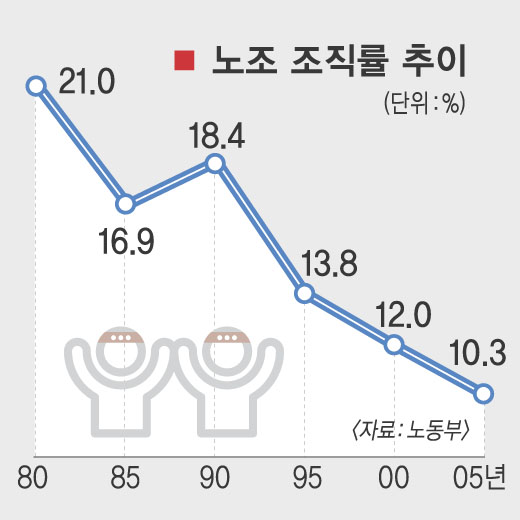 이는 관련 통계가 발표되기 시작한 1977년의 25.4% 이래 최저치다. 노조 조직률은 70년대 후반과 80년대 초반까지는 20%를 웃돌았으나 83년(19.4%)부터 20% 이하로 떨어진 뒤 등락을 거듭하다 89년 19.8%를 정점으로 지속적으로 하락하고 있다. 이같은 노조 조직률은 타이완(37.0%), 영국(26.2%), 싱가포르(25.0%,2004년 기준), 독일(22.3%,2002년 기준), 일본(18.7%), 미국(12.5%) 등에 비해 훨씬 낮은 수준이다. 노동조합 수와 조합원 수도 줄어들고 있다. 지난해 노동조합 수는 5971개로 전년에 비해 46개(0.8%)가 줄었고, 조합원 수도 150만 6000명으로 전년에 비해 3만 671명(2.0%) 감소했다.