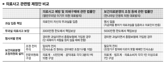 현재 열린우리당 이기우 의원이 2005년 11월 발의한 ‘의료사고 예방 및 피해구제에 관한 법률’안과 의사 출신인 한나라당 안명옥 의원이 올 5월 발의한 ‘보건의료분쟁의 조정 등에 관한 법률’안이 국회 보건복지위에 올라와 있다.