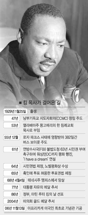흉탄에 스러진 지 38년이 지나서야 평생을 민권운동에 헌신한 그의 이름이 새겨진 기념관의 첫 삽이 떠졌다. 아프리카계 미국인 최초의 기념관인 마틴 루터 킹 목사 기념관 기공식이 워싱턴DC 한복판에 있는 내셔널몰에서 13일(현지시간) 성대히 열렸다고 CNN이 전했다. 주요 방송들은 이를 생중계했고 뉴욕, 휴스턴 등 주요 도시에선 추모 행사와 콘서트가 잇따랐다.