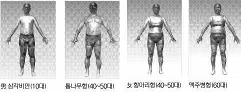 여성은 20∼30대에서 여전히 ‘삼각비만’이 전체 비만유형의 56.4%로 가장 많았지만 40∼50대에서는 삼각비만과 어깨가 좁고 어깨 아래로 비만인 ‘맥주병형 비만’, 배가 나오고 어깨가 넓은 ‘역(逆)삼각비만’, 하체에 비해 상체가 뚱뚱하고 어깨가 좁은 ‘항아리형 비만’이 각각 20%대의 비슷한 비중을 보였다.