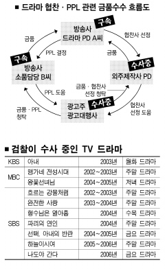 ‘파리의 연인’‘하늘이시여’‘왕꽃선녀님’‘아내’ 등 폭발적인 인기를 끌었던 드라마의 제작 과정에 지저분한 돈거래가 있었던 것으로 드러났다. 드라마 협찬사로 선정하거나 간접광고(PPL)를 해주는 대가로 금품을 받은 지상파 방송국 드라마 PD와 외주제작사 PD 등이 검찰에 적발됐다. 검찰은 SBS·MBC·KBS 등 방송 3사의 드라마들에 대해 전면적인 수사를 펴기로 했다.