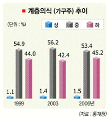 통계청이 지난 7월 만 15세 이상의 전국 남녀 7만명을 상대로 조사해 4일 발표한 ‘2006년 사회통계조사결과’에 따르면 가구주의 53.4%가 자신을 중산층이라고 답했다.2003년 56.2%보다 2.8%포인트 감소했다. 하류층이라는 답변은 45.2%로 2.8%포인트 늘었다. 중산층에서 빠진 계층이 그대로 하류층으로 흡수됐다. 상류층은 1.46%로 거의 변동이 없다.