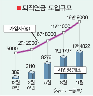 노동부는 “지난해 12월 도입 이후 올 11월 말까지 노사 합의 등으로 퇴직연금제를 선택한 업체 수는 1만 4822개, 가입자 수는 16만 9266명, 금융기관을 통한 적립액은 5608억원으로 집계됐다.”고 12일 밝혔다.