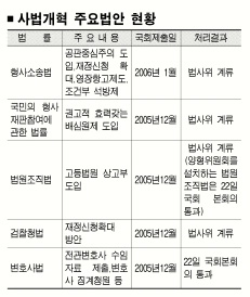 법원과 검찰의 갈등 해소 방안의 하나로 여겨지는 것이 바로 사법개혁추진위원회(사개추위)의 ‘형사소송법 개정안’이다. 법원, 검찰, 변호사가 모두 합의해 국회에 계류돼 있기 때문에 겉으로 보기엔 국회 통과만 되면 갈등은 사라질 것으로 예상된다. 하지만 속내를 들여다 보면 그리 간단하지 않다. 여전히 적용 범위 등에 대한 신경전이 계속되고 있다.