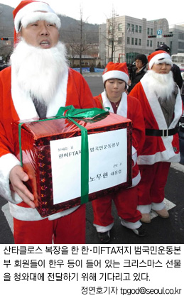 뼛조각에 이어 다이옥신까지 잇따라 검출된 미국산 쇠고기가 한·미 자유무역협정(FTA) 협상의 ‘태풍의 눈’으로 떠오른 가운데 크리스마스 연휴를 맞아 열린우리당과 한나라당 당사에 ‘몰래 산타’의 특별한 선물이 도착했다. 청와대와 외교통상부엔 경찰의 저지로 전달되지 못했다.
